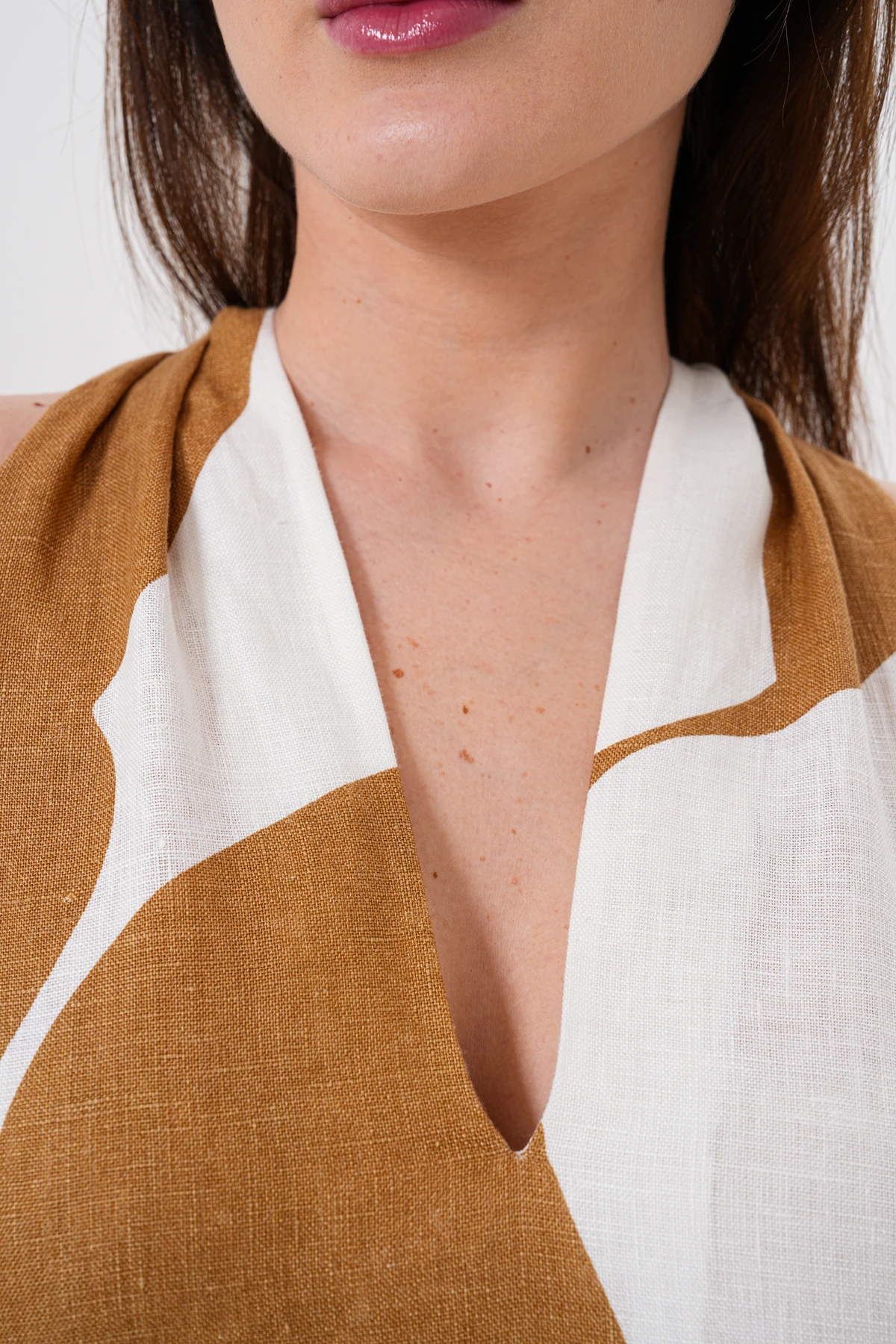 ✨ Atlas Kahve & Krem Desenli Keten Elbise – Doğanın Ritmini Giymek